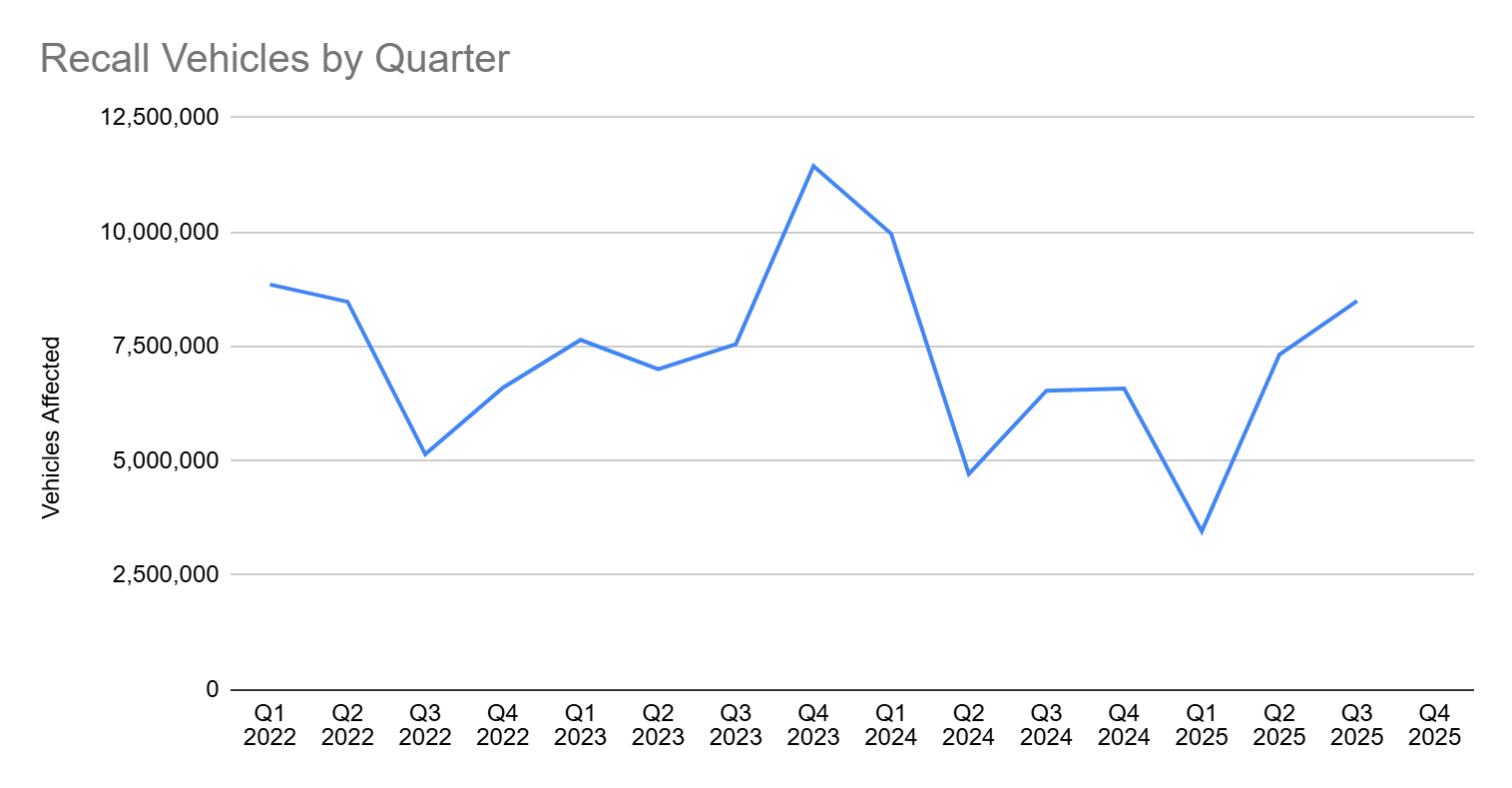 In Q3 2025, automakers issued 96 recall campaigns covering 8,494,262 vehicles, a 16% increase from Q2’s 7.32 million.
