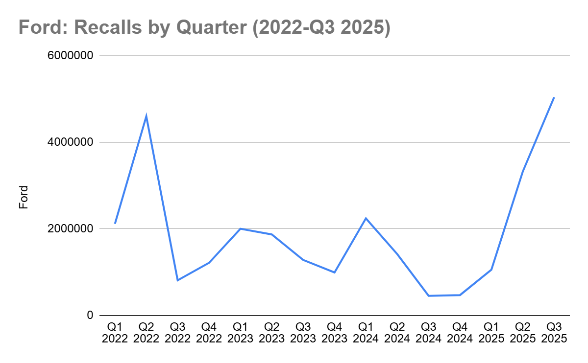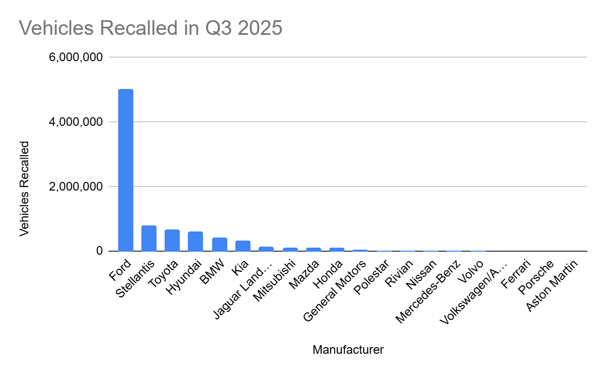 Ford led all manufacturers in Q3 2025 with 5,041,241 vehicles affected. The next four were Stellantis (802,383), Toyota (685,697), Hyundai (612,278), and BMW (415,893), each contributing substantial volumes this quarter.