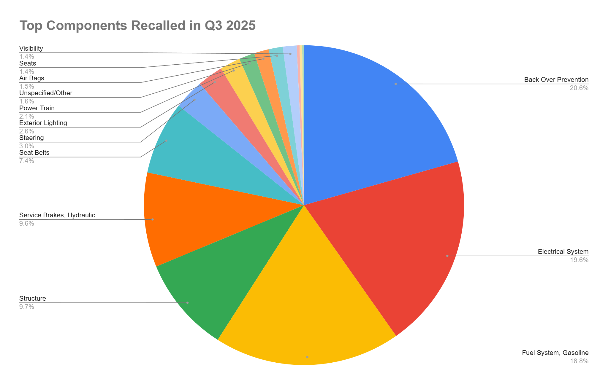 Back Over Prevention was the largest category in Q3, impacting 1,749,524 vehicles. Electrical System issues followed at 1,668,743 vehicles, with Fuel System, Gasoline close behind at 1,598,639. Service Brakes, Hydraulic (811,435) and Structure (820,893) also represented significant portions of the quarter’s recalls.